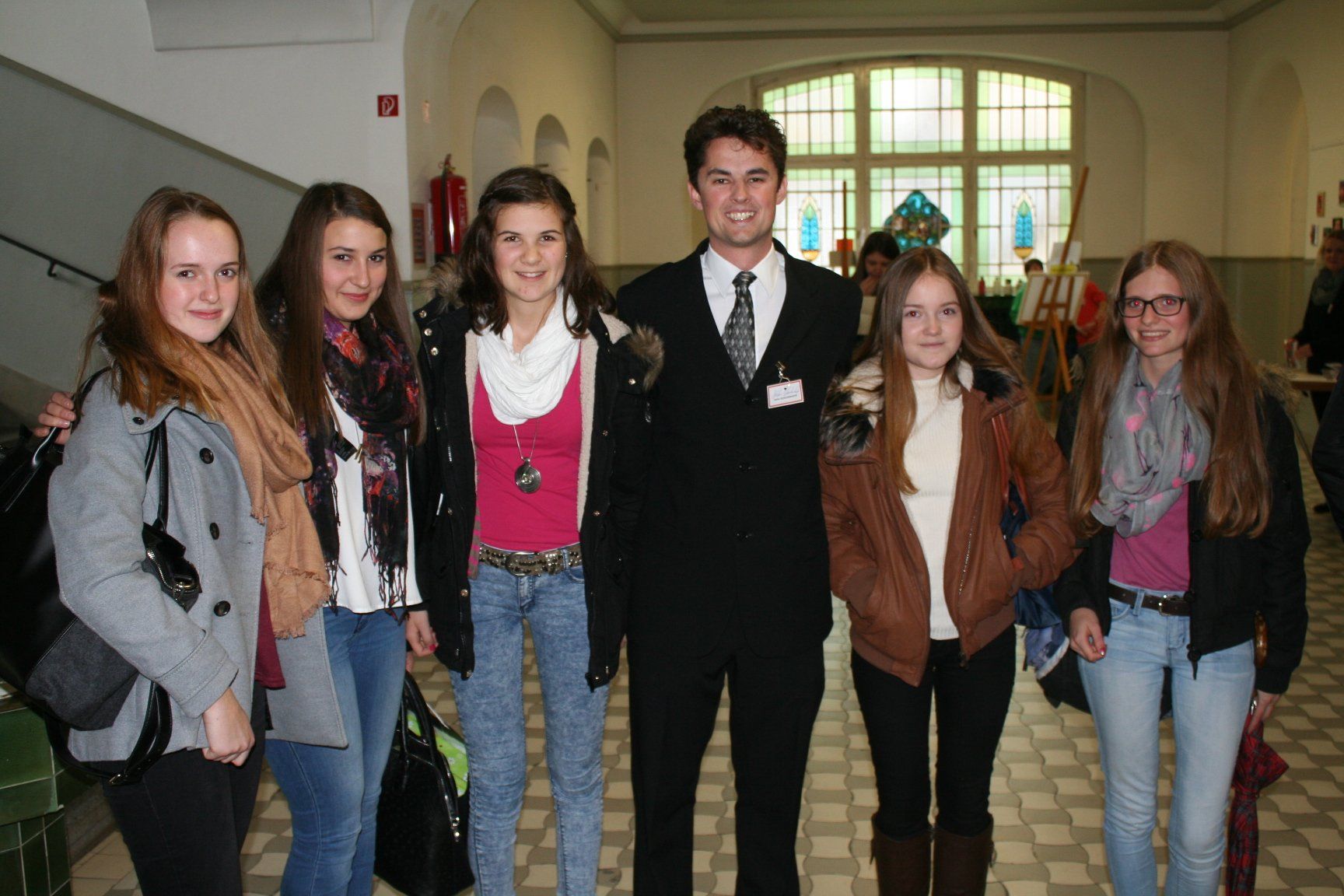 Herr Lehrer Schachenhofer inmitten von ehemaligen Schülerinnen
