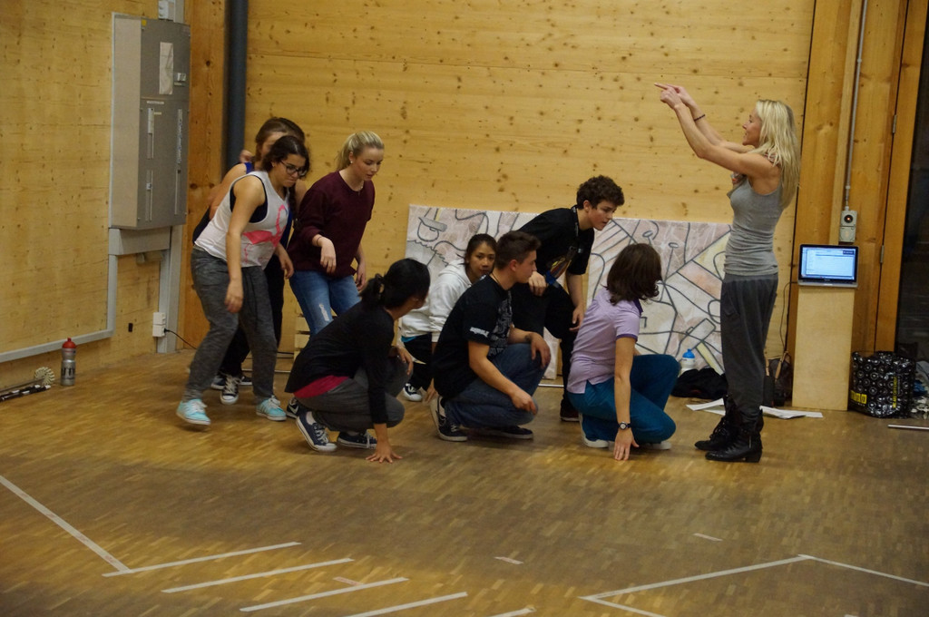 Tamara Kaufmann (ganz rechts) probt seit Monaten mit 150 Laiendarstellern aus der Region für die EYOF-Eröffnungsfeier.