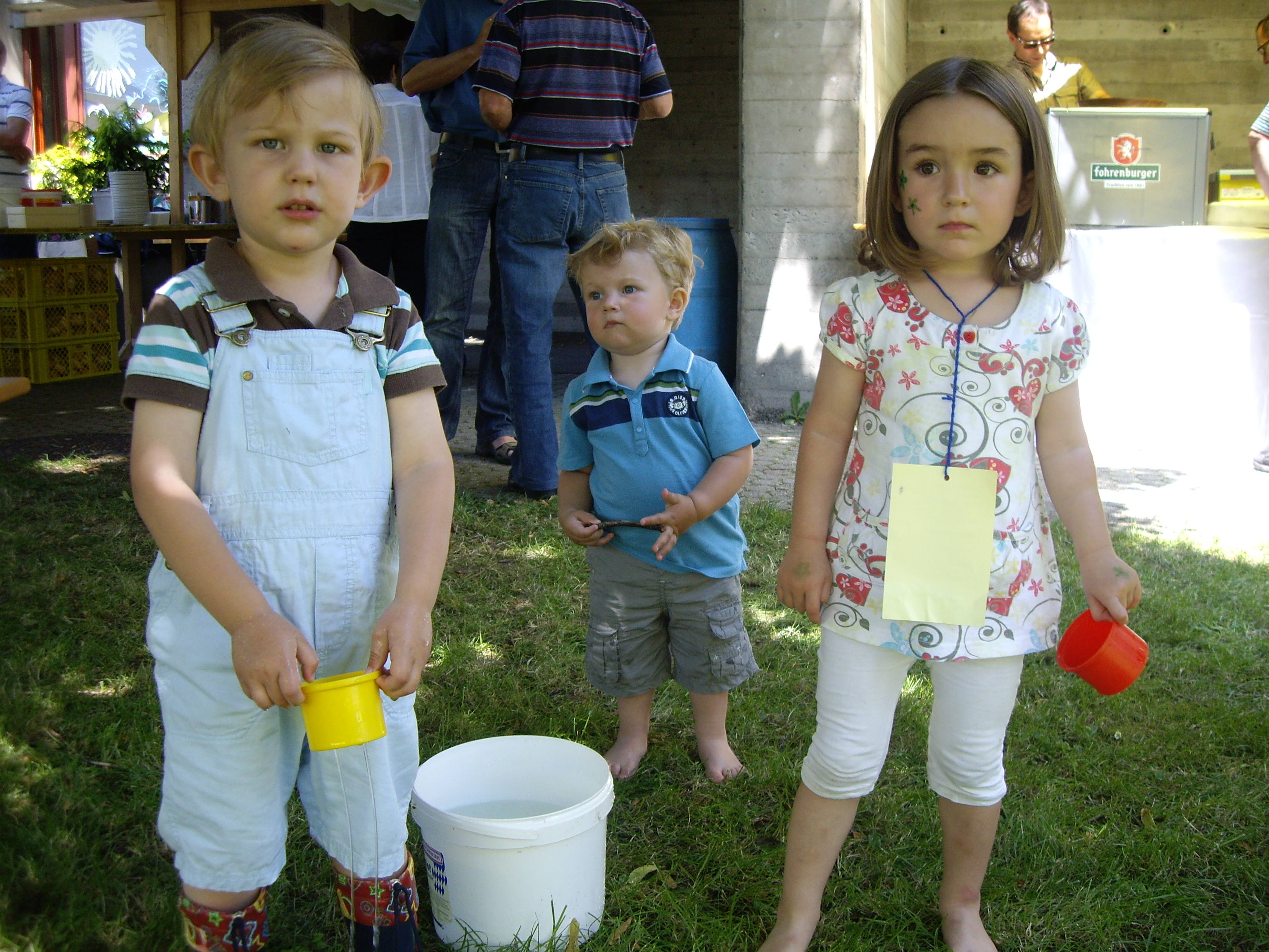 Emil, Fabian und Kathrin beim Spielen auf der Pfarrwiese.