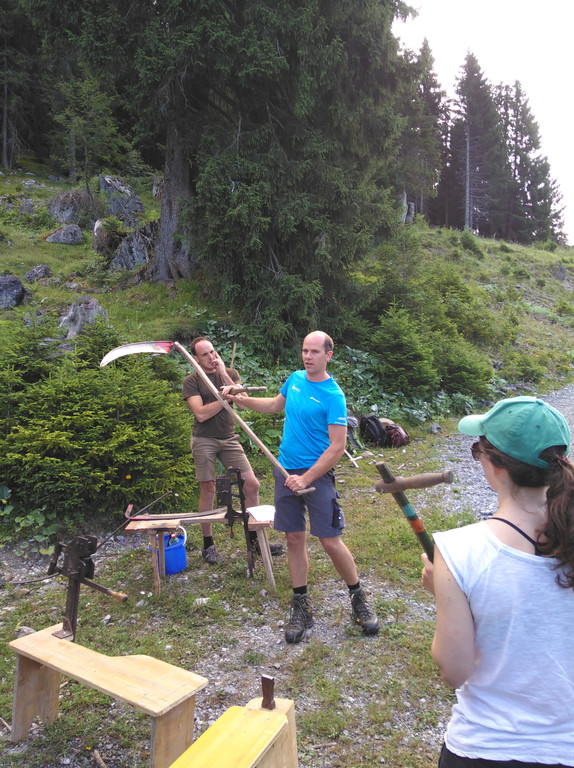 Fabian Winder und Manuel Metzler schulten die Vielfalter im Sensenmähen