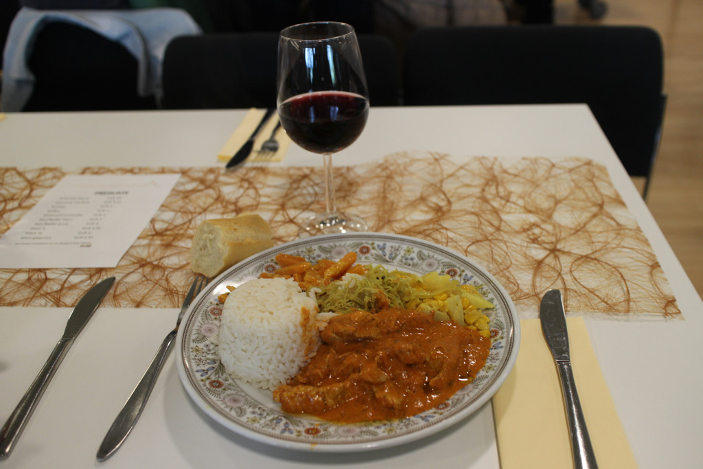 Es gab würzig geröstetes Hühnerfleisch mit einer Kokos-Kräuter-Rahmsauce, dazu Babykarotten, Kraut, Curry-Ananas-Mais und Reis