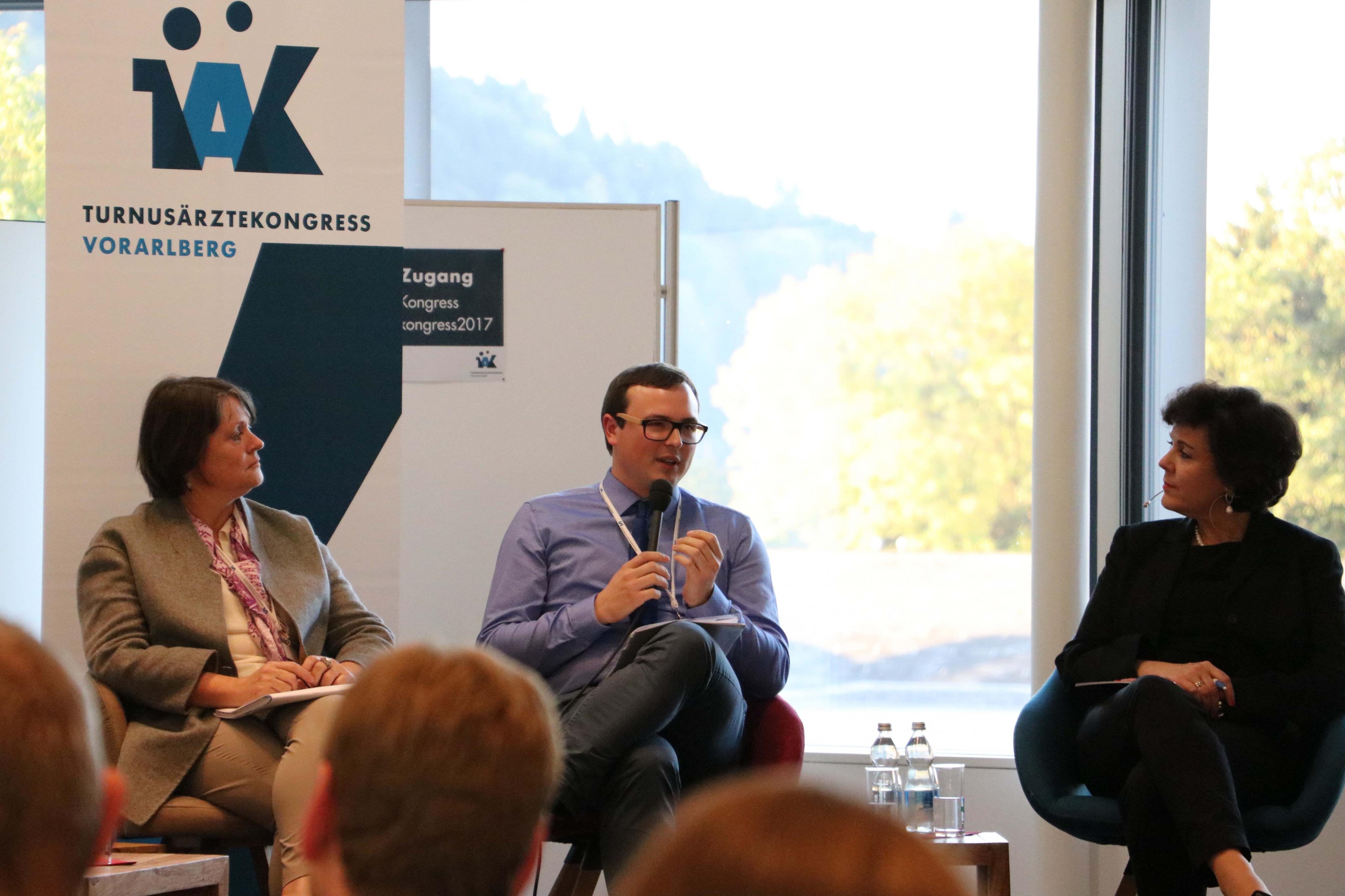 Dr. Silvia Türk (Leiterin der Abteilung Qualitätsmanagement und Gesundheitssystemforschung des BM für Gesundheit u. Frauen), Dr. Lukas Marth (Ausbildungsarzt, LKH Feldkirch), Dr. Agnes M. Mühlgassner, Chefredakteurin der Österreichischen Ärztezeitung: Bei der Diskussion zum Thema „Basisausbildung - Top oder Flop?“ gingen die Meinungen teilweise auseinander.