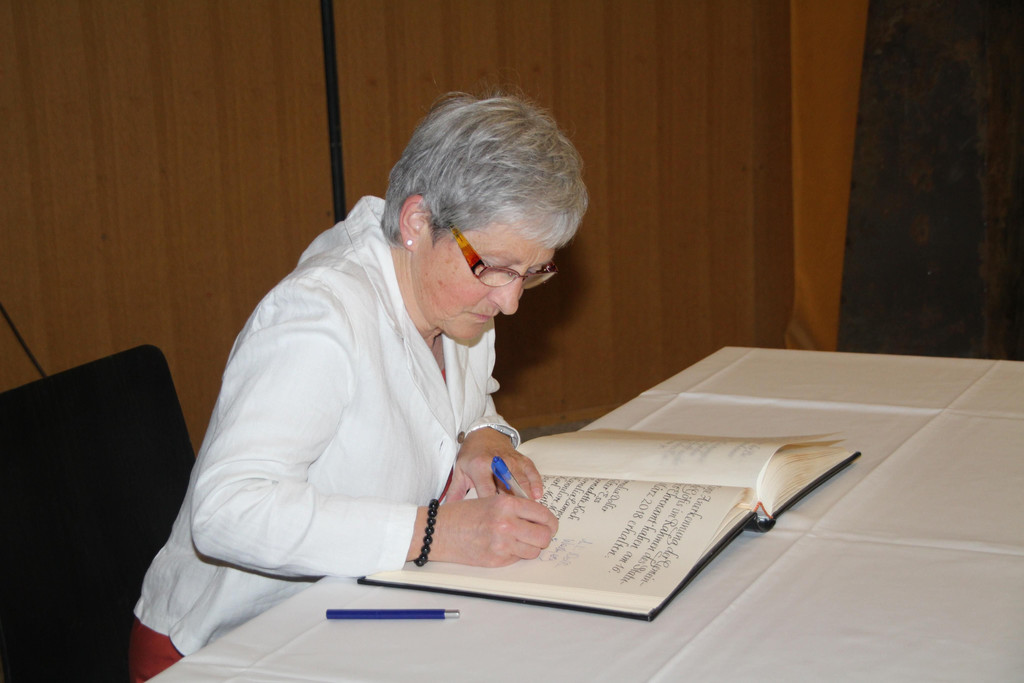 Bernadette Koch unterzeichnet im Ehrenamtbuch.