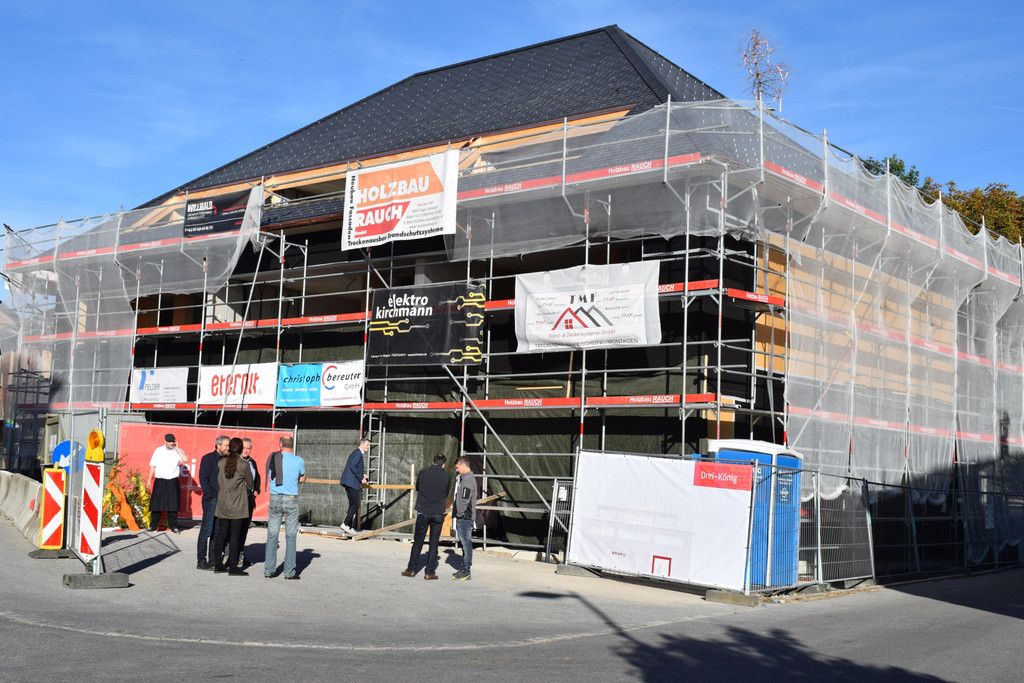 Der Rohbau ist abgeschlossen, die Arbeiten an der Fassade sind in vollem Gange.