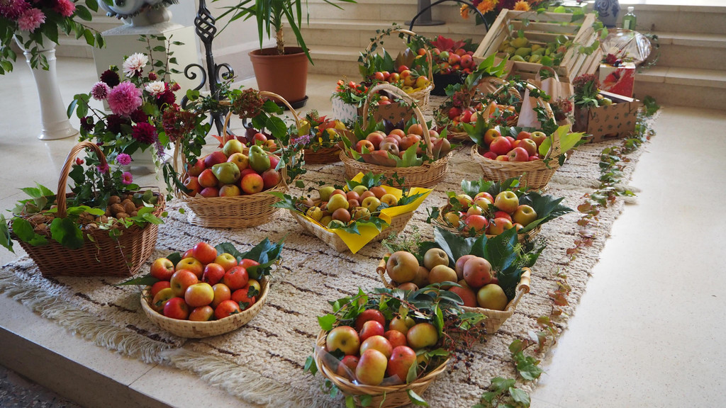 Bunt geschmückte Kirche anläßlich des Erntedankfests