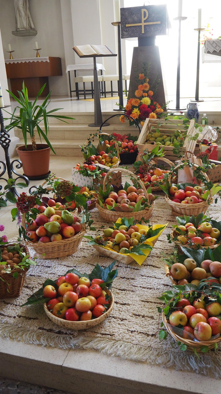 Bunt geschmückte Kirche anläßlich des Erntedankfests