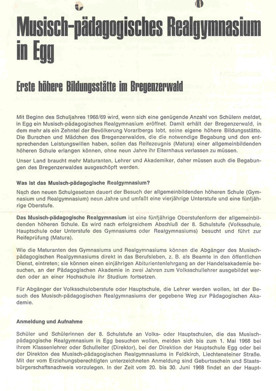 Am 11. September 1968 wurde das Gymnasium Egg als Musisch-Pädagogisches Realgymnasium eröffnet.