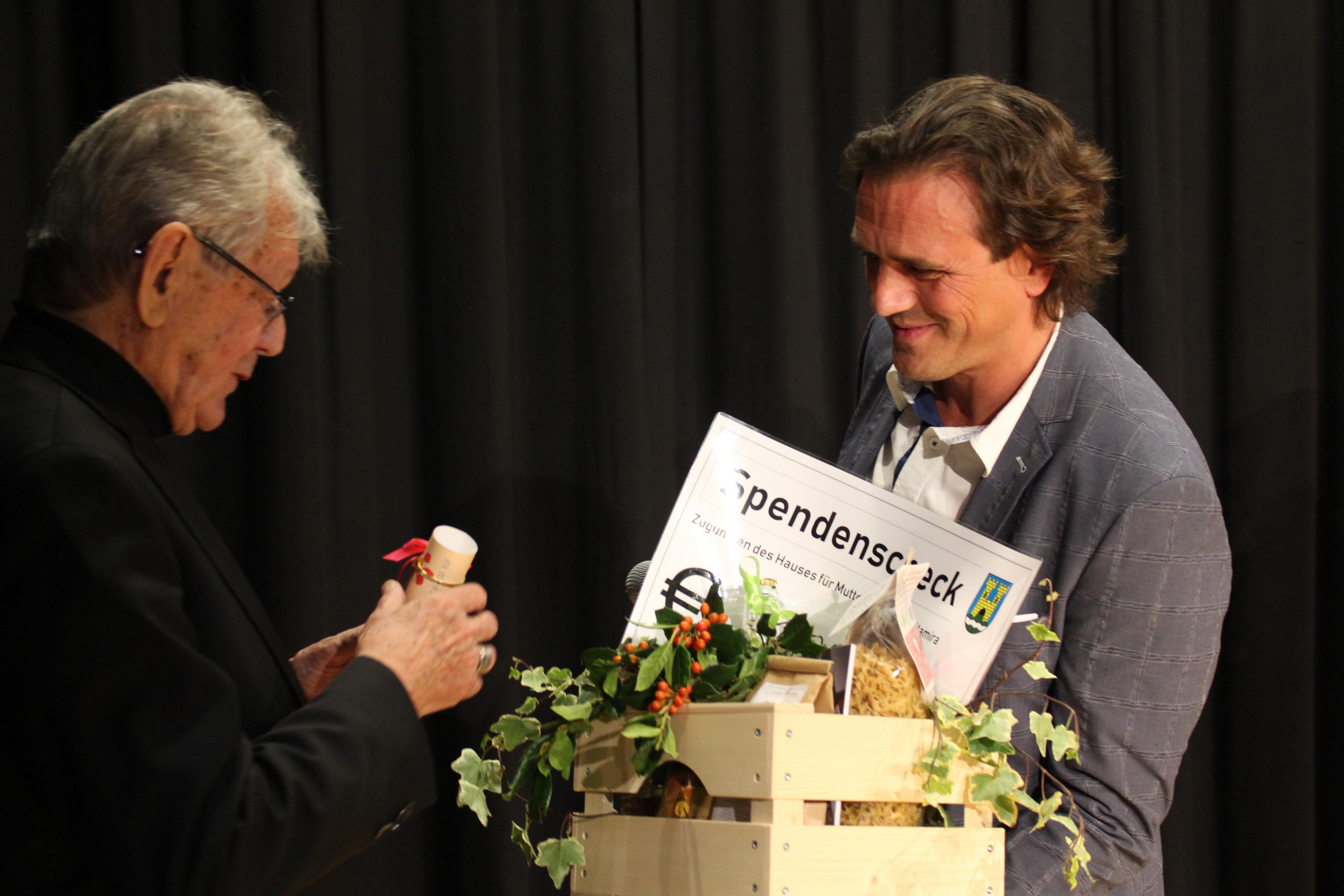 Bürgermeister Gerd Hölzl mit einem Geschenk der Gemeinde