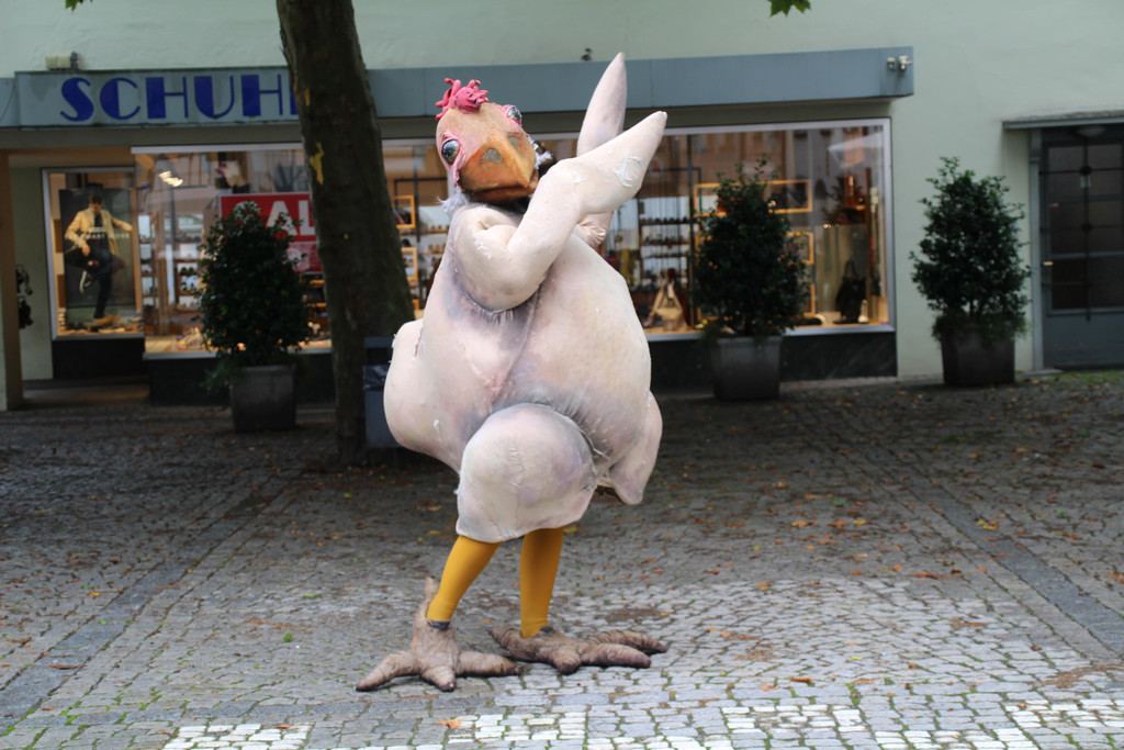 Bissiges Straßentheater mit Huhn