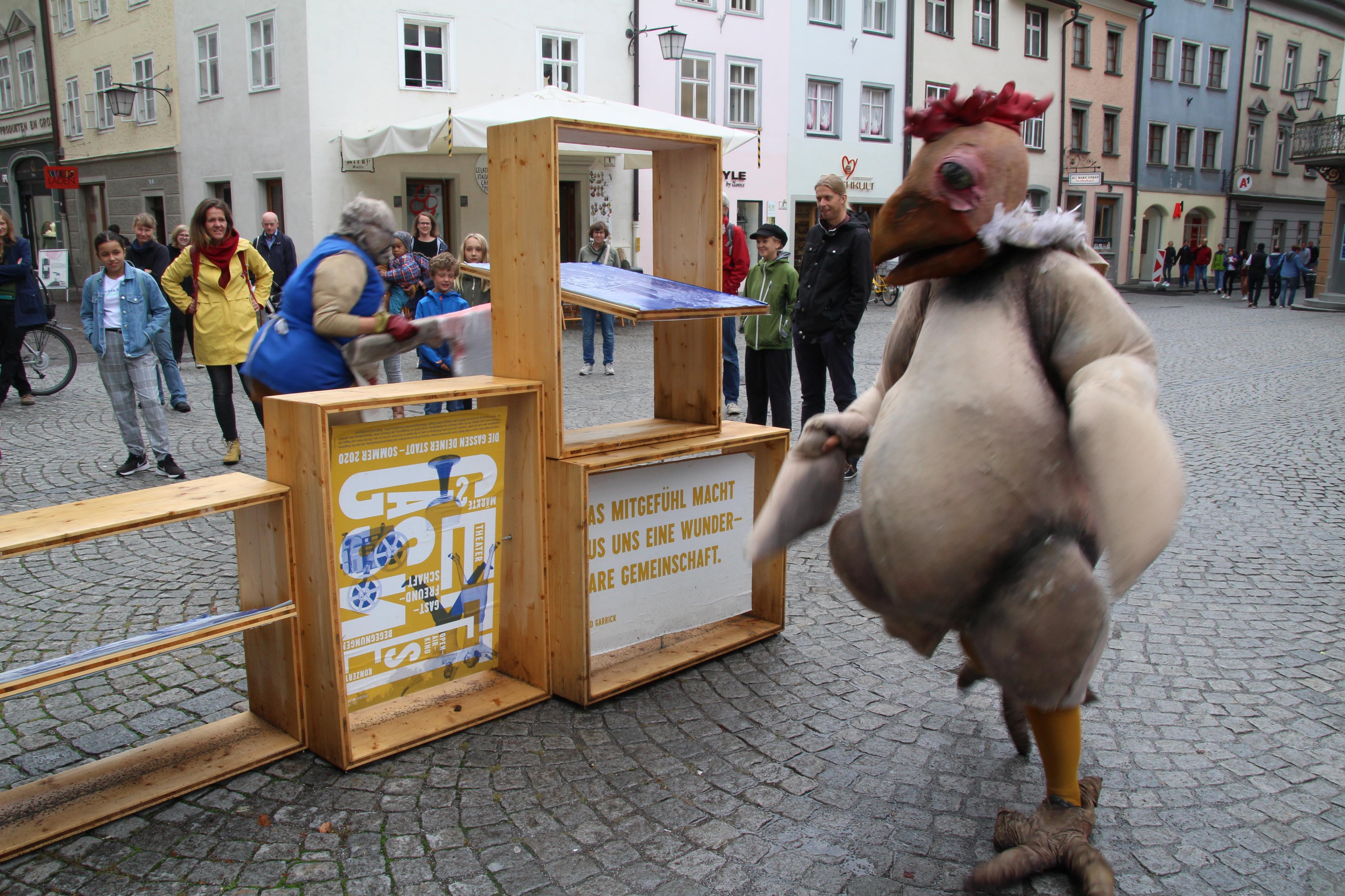 Bissiges Straßentheater mit Huhn