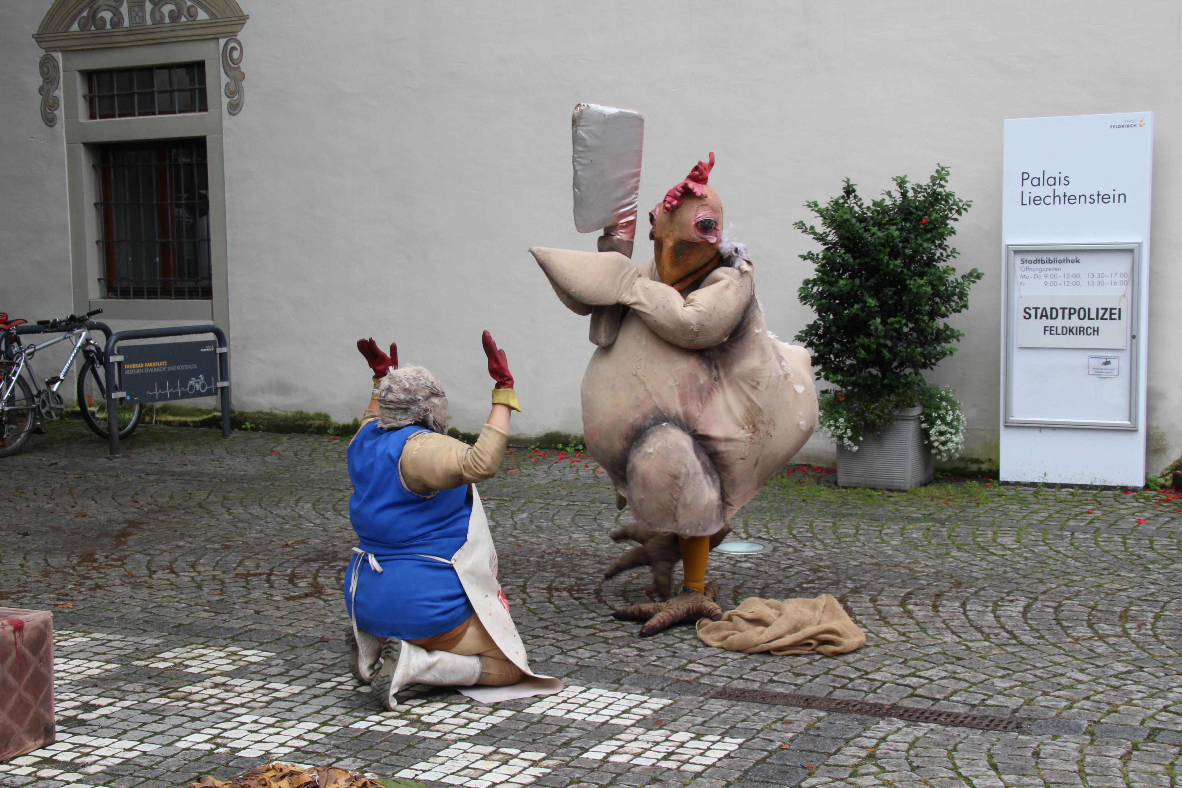 Bissiges Straßentheater mit Huhn