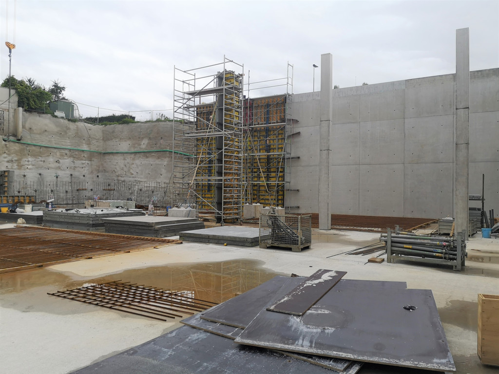 Teile der Seitenwände und Stützsäulen sind bereits errichtet.