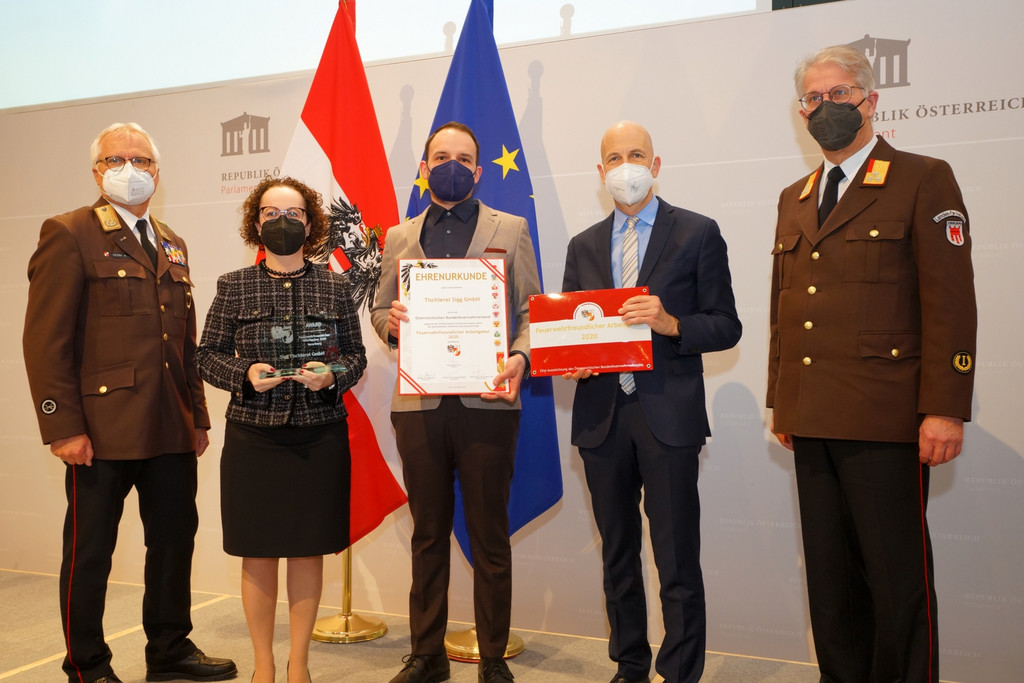 Übergabe der Urkunde an Benedikt Sigg in Wien: Feuerwehrpräsident Albert Kern, Bundesratspräsidentin Christine Schwarz-Fuchs, Benedikt Sigg, Arbeitsminister Martin Kocher, Bezirksfeuerwehrinspektor Bludenz Christoph Feuerstein (vlnr)(Bildquelle: LFV Stmk/Fink)