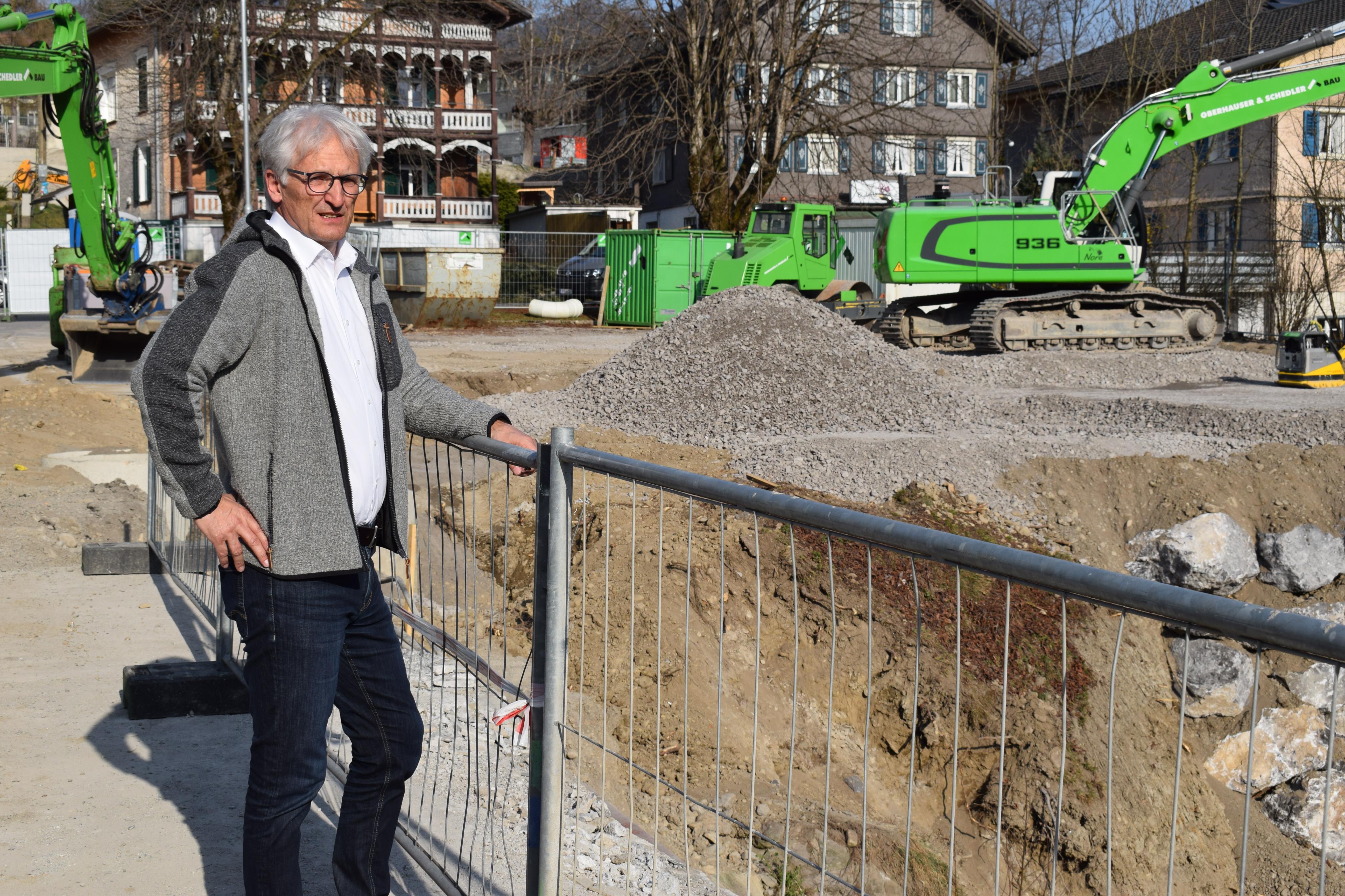 Bgm. Paul Sutterlüty beim Lokalaugenschein auf der Brückenbaustelle im Egger Zentrum.