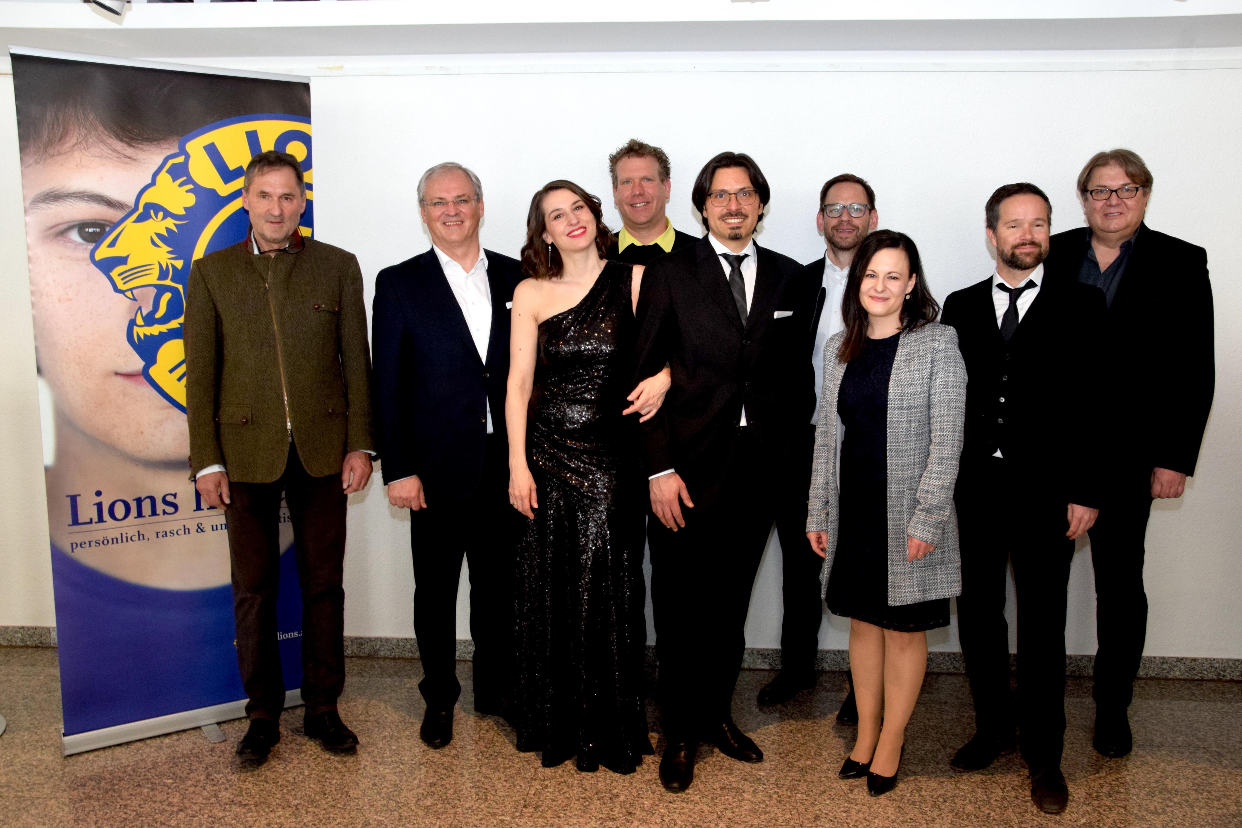 Lions Club Bludenz-Präsident Thomas Beck, Landtagspräsident Harald Sonderegger, Mezzosopranistin Marija Jokovic, Dir. Christian Mathis (Musikschule Walgau), Dirigent Vito Cristofaro, Dir. Christoph Ellensohn (Musikschule Blumenegg/Großes Walsertal), Dir. Julia Großsteiner (Musikschule Brandnertal), Dir. Ralph Hollenstein (Musikschule Montafon) und Dir. Hans Finner (Musikschule Lech)