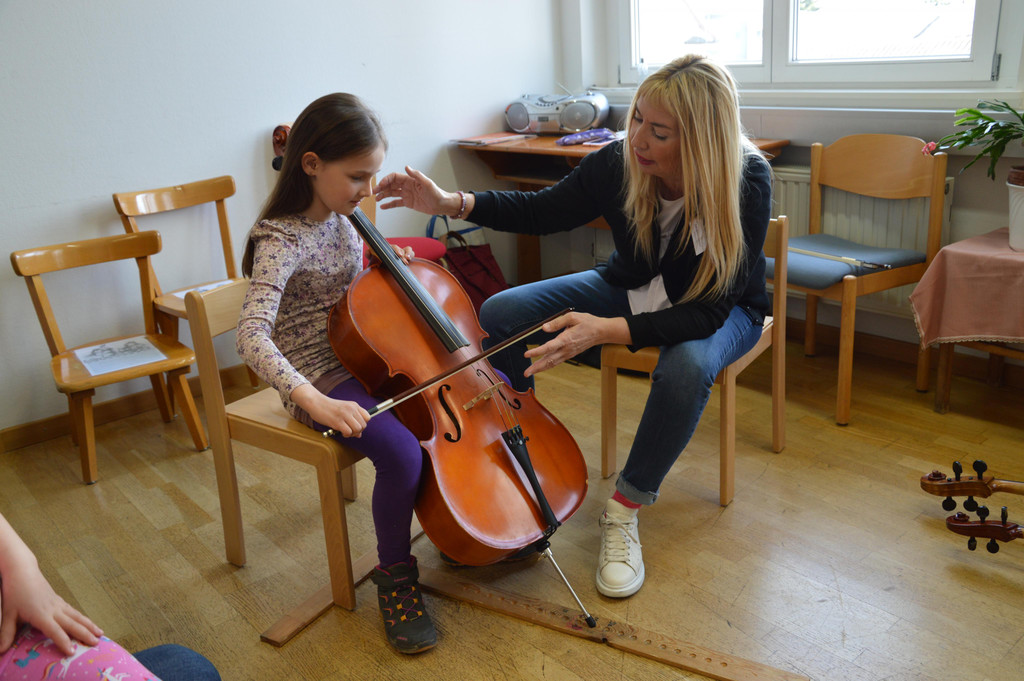 Auch das Cello wird von Rosa ausprobiert (Lehrerin Fausta Paroli)