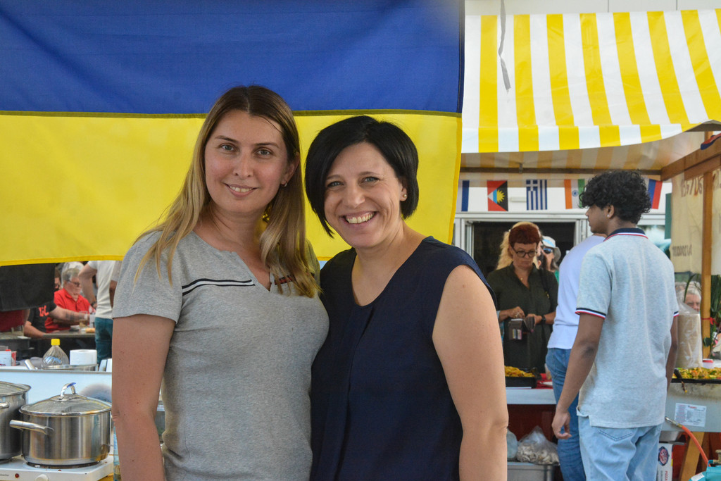 Gemeinderätin Eveline Mairer von den Grünen (rechts) genoss am Stand der Ukrainer mit Olena (links) das tolle Marktflair.