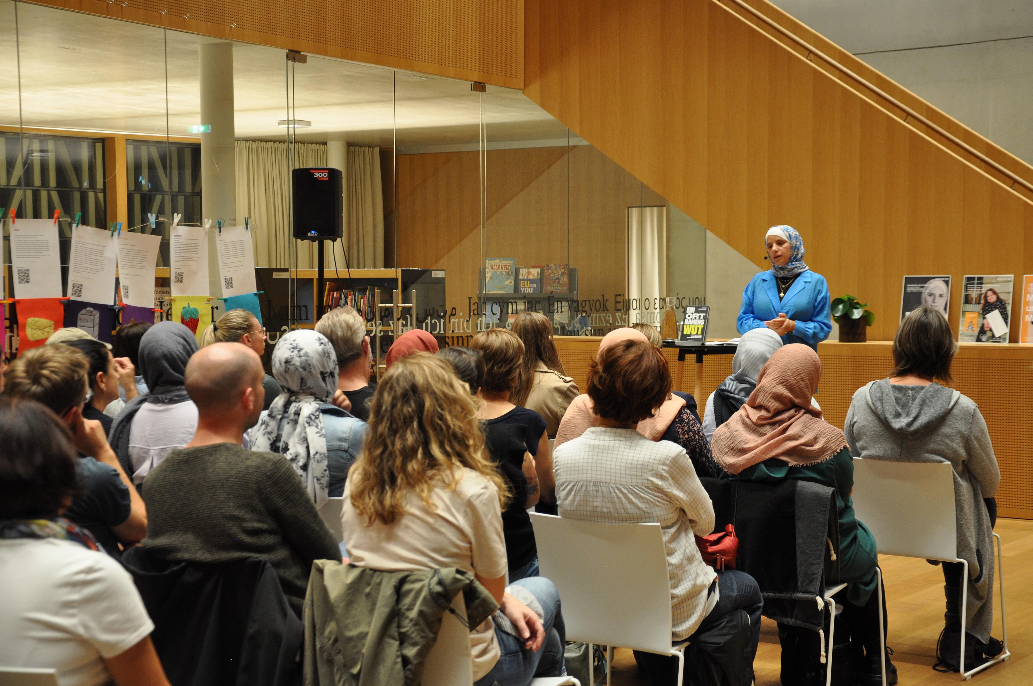 Im Anschluss an ihr Referat stand Amani Abuzahra dem Publikum Rede und Antwort.