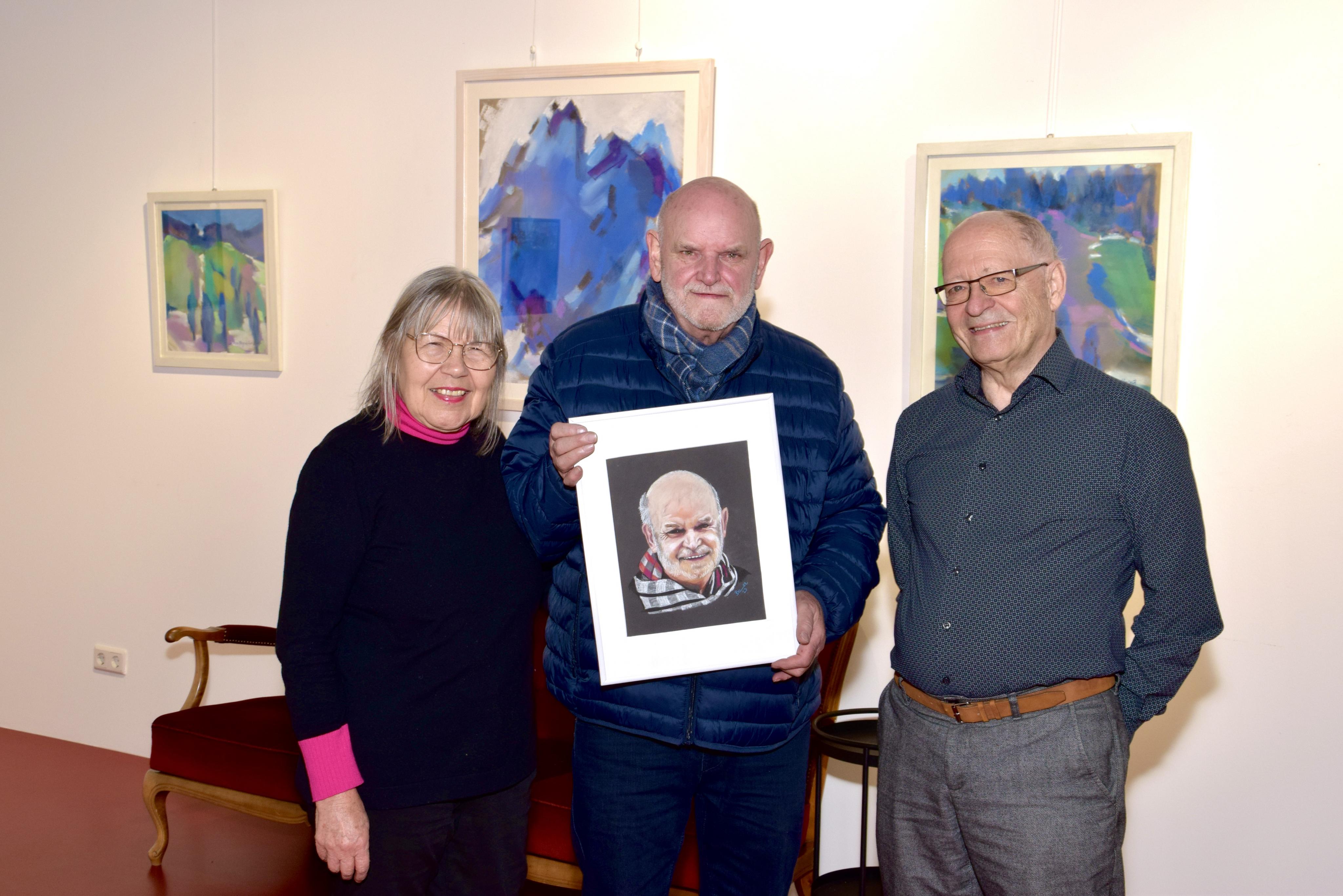 In der Kellergalerie Kukuphi in Bludenz, wo noch bis 23. Dezember 2023 (14 Uhr) Arbeiten von Carmen Margot Lins ausgestellt sind, überraschte Künstler Kurt Bonner seinen Künstlerkollegen Walter Zingerle mit einem selbst hergestellten Portrait in Pastell.