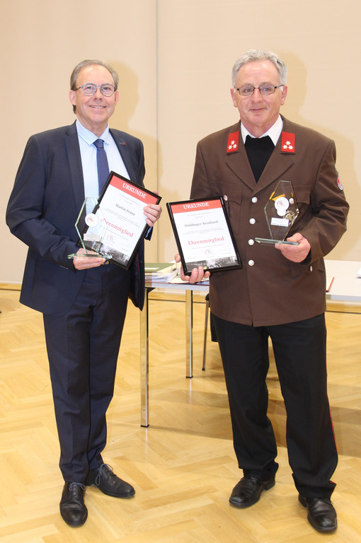Bürgermeister Franz Martin und Reinhard Waldinger freuten sich über die Ehrenmitgliedschaft der Feuerwehr Buch