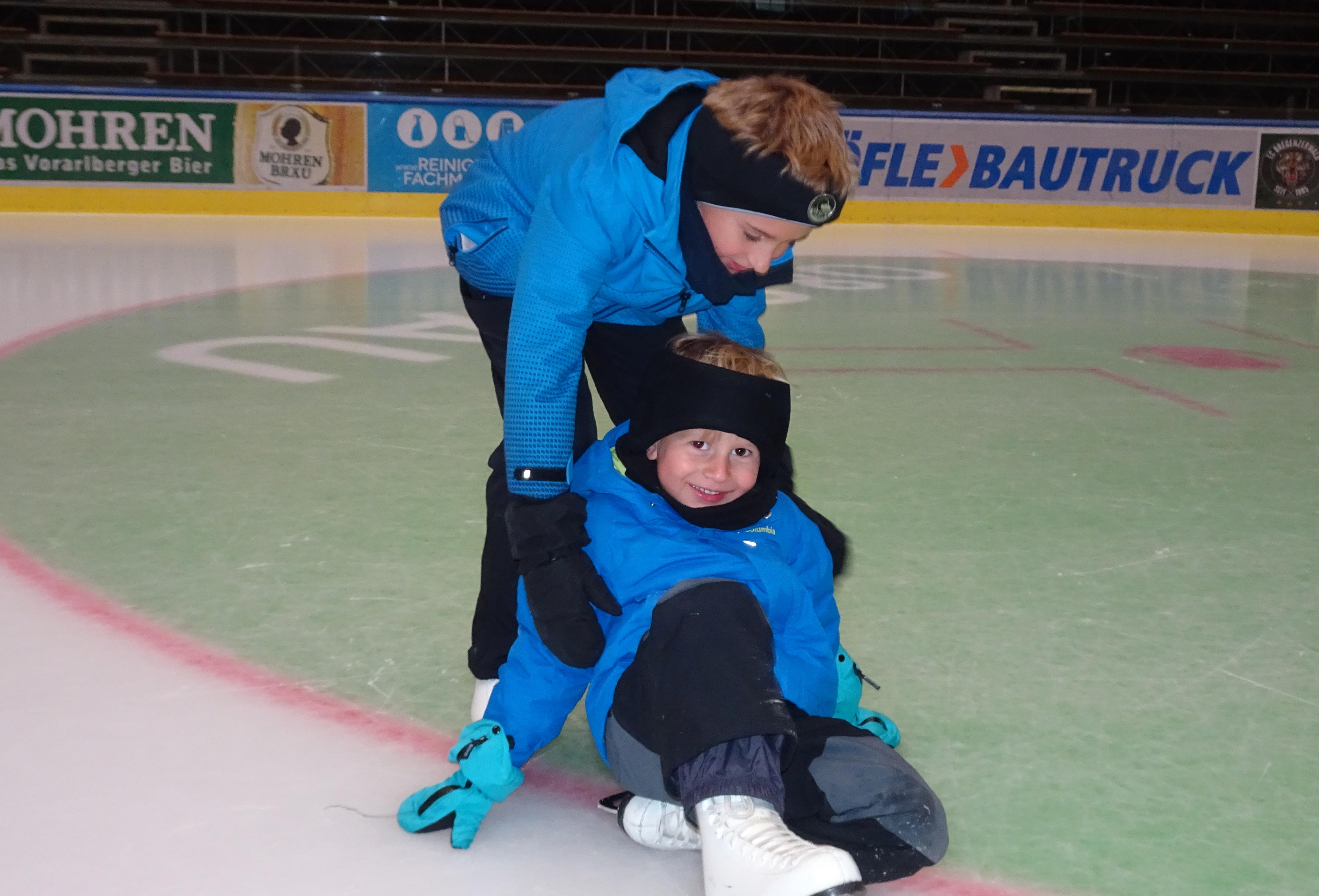 Jonathan half seinem kleinen Bruder David, der noch ein Neuling auf dem Eis war.