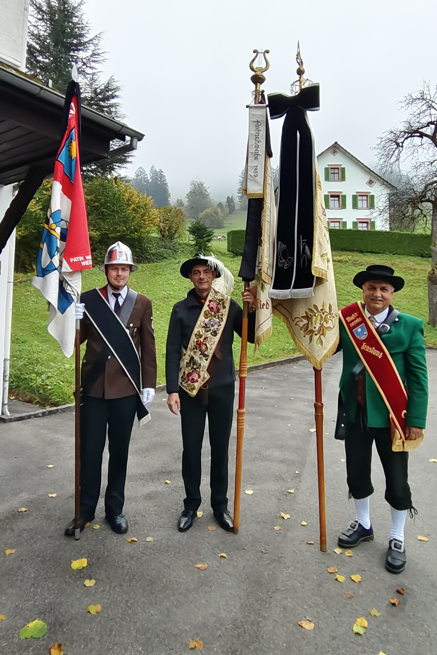 Die Fahnenträger der Feuerwehr, des Männer- & Frauenchors und des Musikvereins Frastanz Mario Müller, Roland Zugliani und Vesi Markovic.
