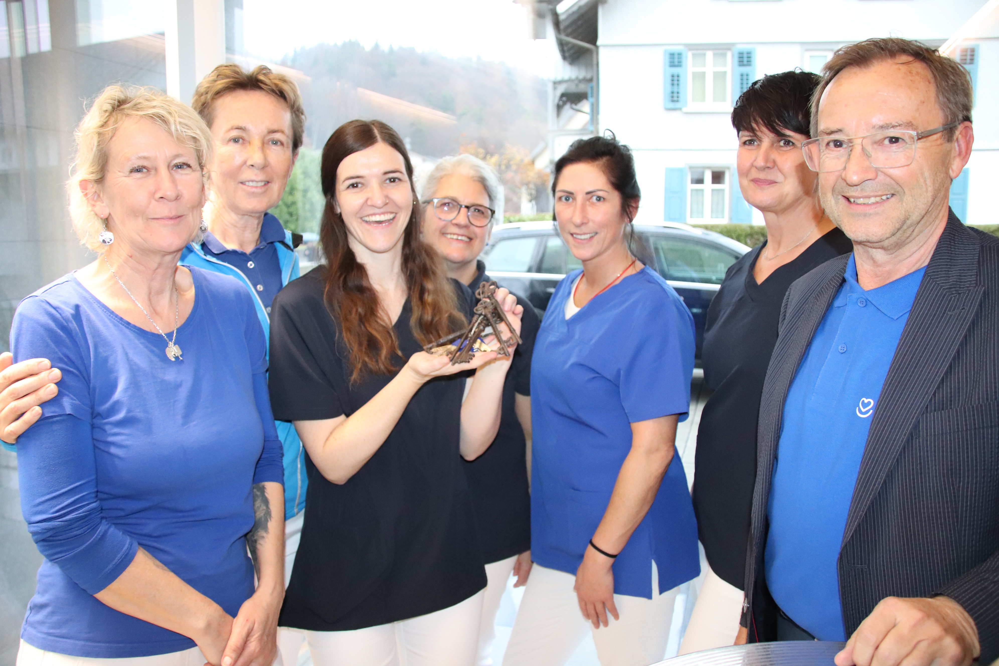 Das Pflegeteam freut sich gemeinsam mit Obmann Werner Böhler über die gelungene Umsetzung der neuen Räumlichkeiten.