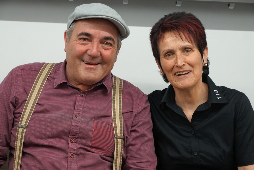 Lothar Gunz (Schauspieler) mit Jahrgängerin Renate Eberle – zuständig für Frisuren & Co- vom Theater in Buch.