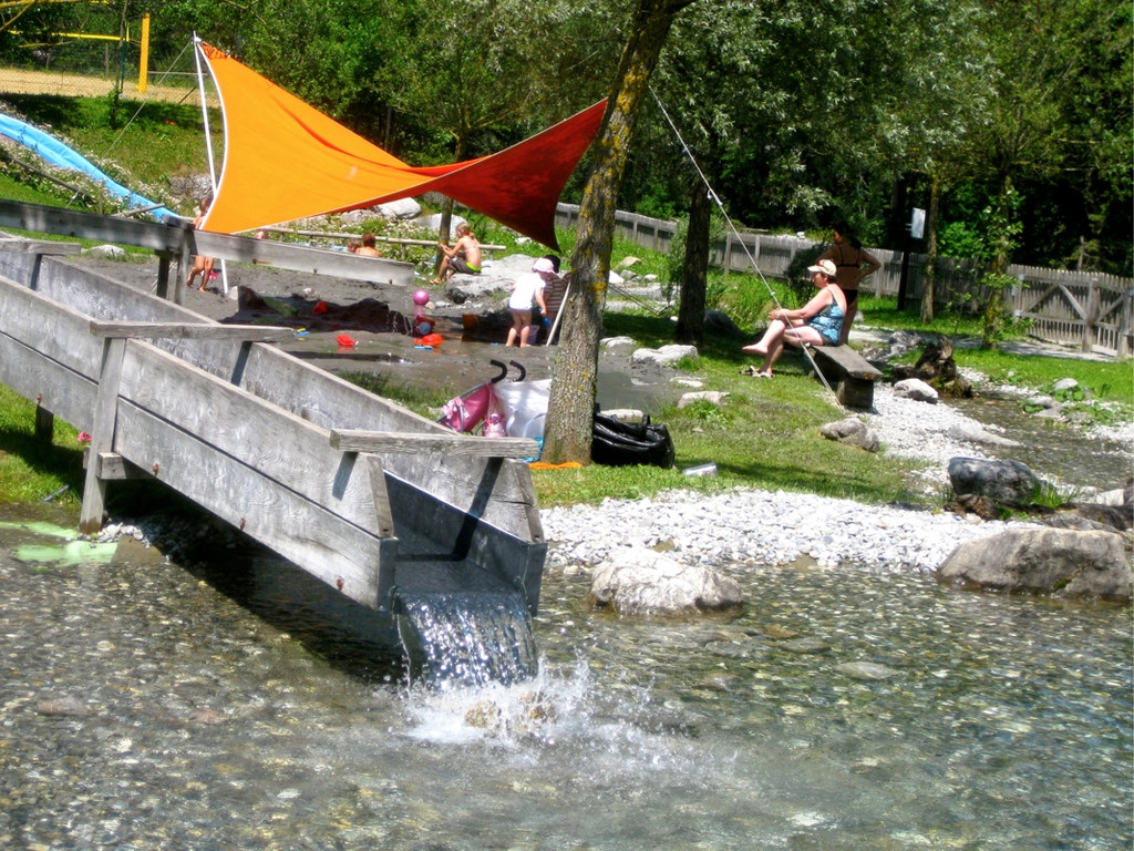 Die Kinder haben viel Spaß im Kindererlebnisbereich mit der Wasserrinne und dem Sandbereich