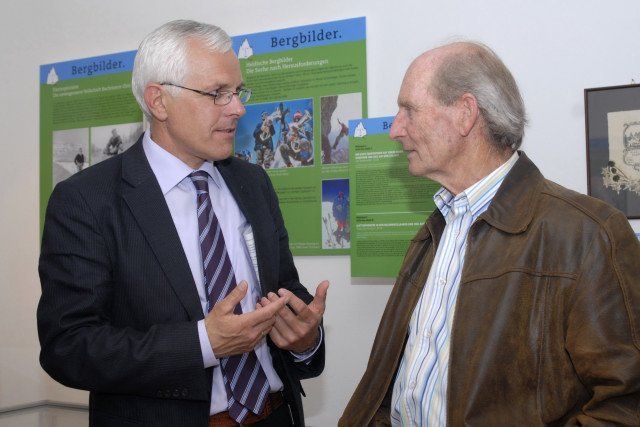 Franz Haag, Österreichischer Alpenverein - Bezirk Montafon, im Gespräch mit Wendelin Tschugmell, Bergführer und ehemaliger Wirt der Heinrich-Hueter-Hütte in der Ausstellung "Bergbilder" in Schruns. (Foto: Gerhard)