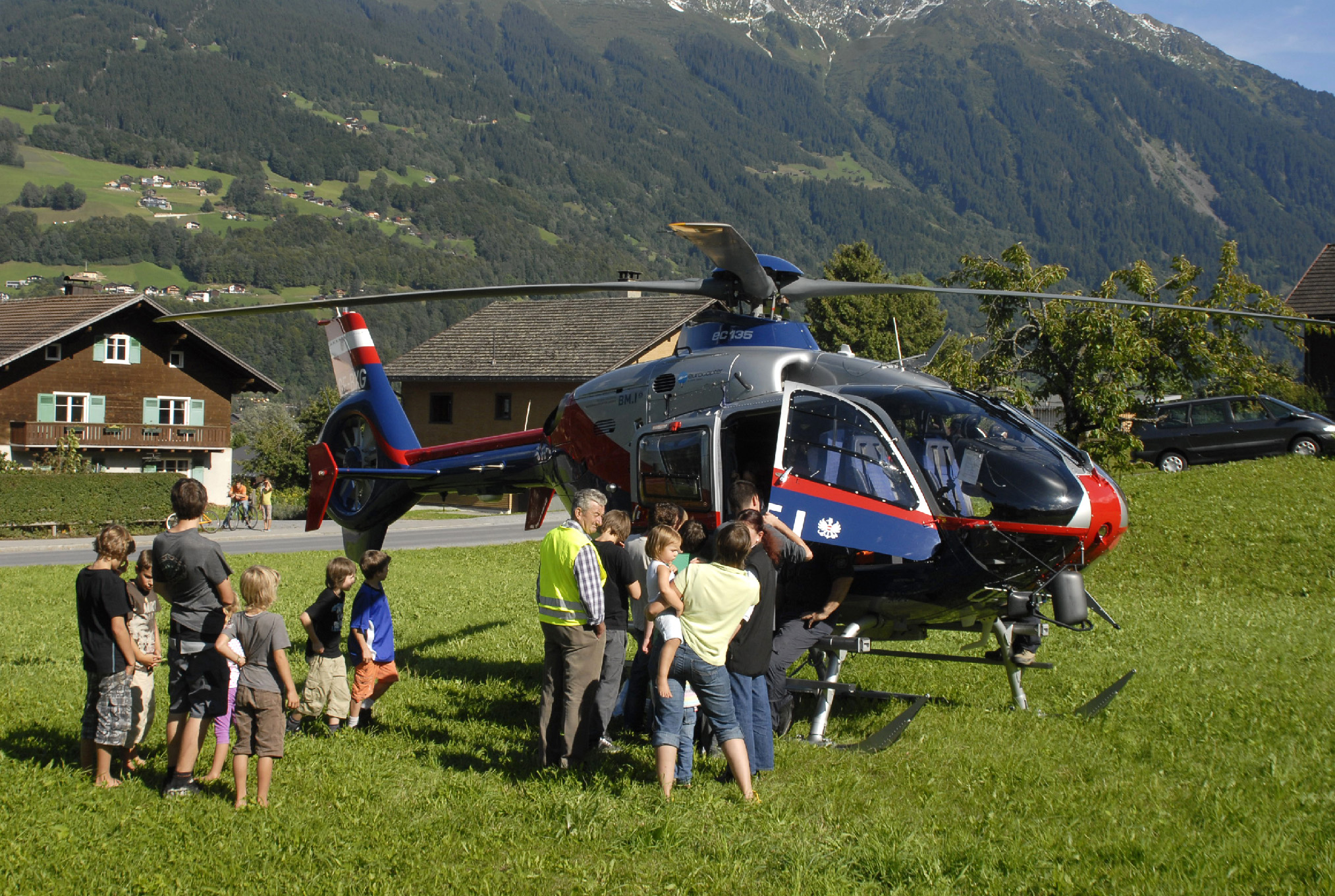 Polizeihubschrauber an der Zelfenstraße in Tschagguns. (Foto: Gerhard Scopoli, 3. Sep. 2010)