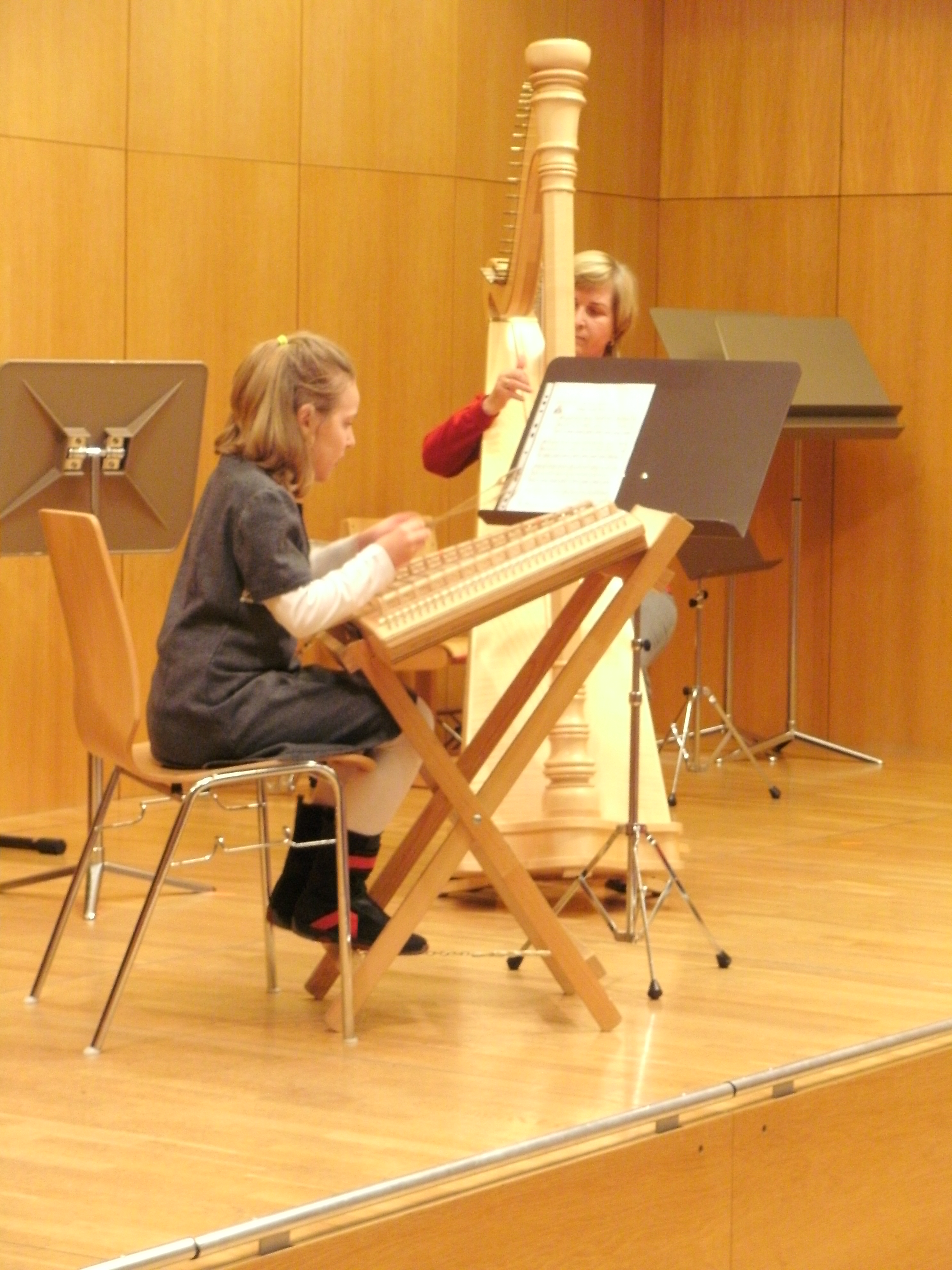 Adeline Marinier spielt am Hackbrett, begleitet von ihrer Lehrerin Elisabeth Schaffenrath