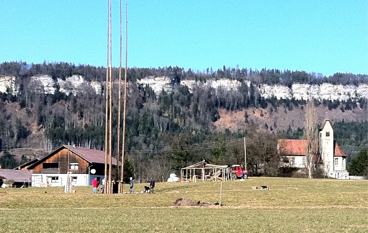 Vier Funkenlatten mit Tannen aus dem Tisner Wald sind bereits fest im Boden verankert und ragen an die 23 Meter hoch in den Himmel und auch die Funkenbar ist schon aufgebaut.