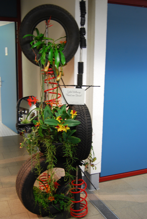 Ein besonderes Arrangement aus Blumen und alten Autoteilen.