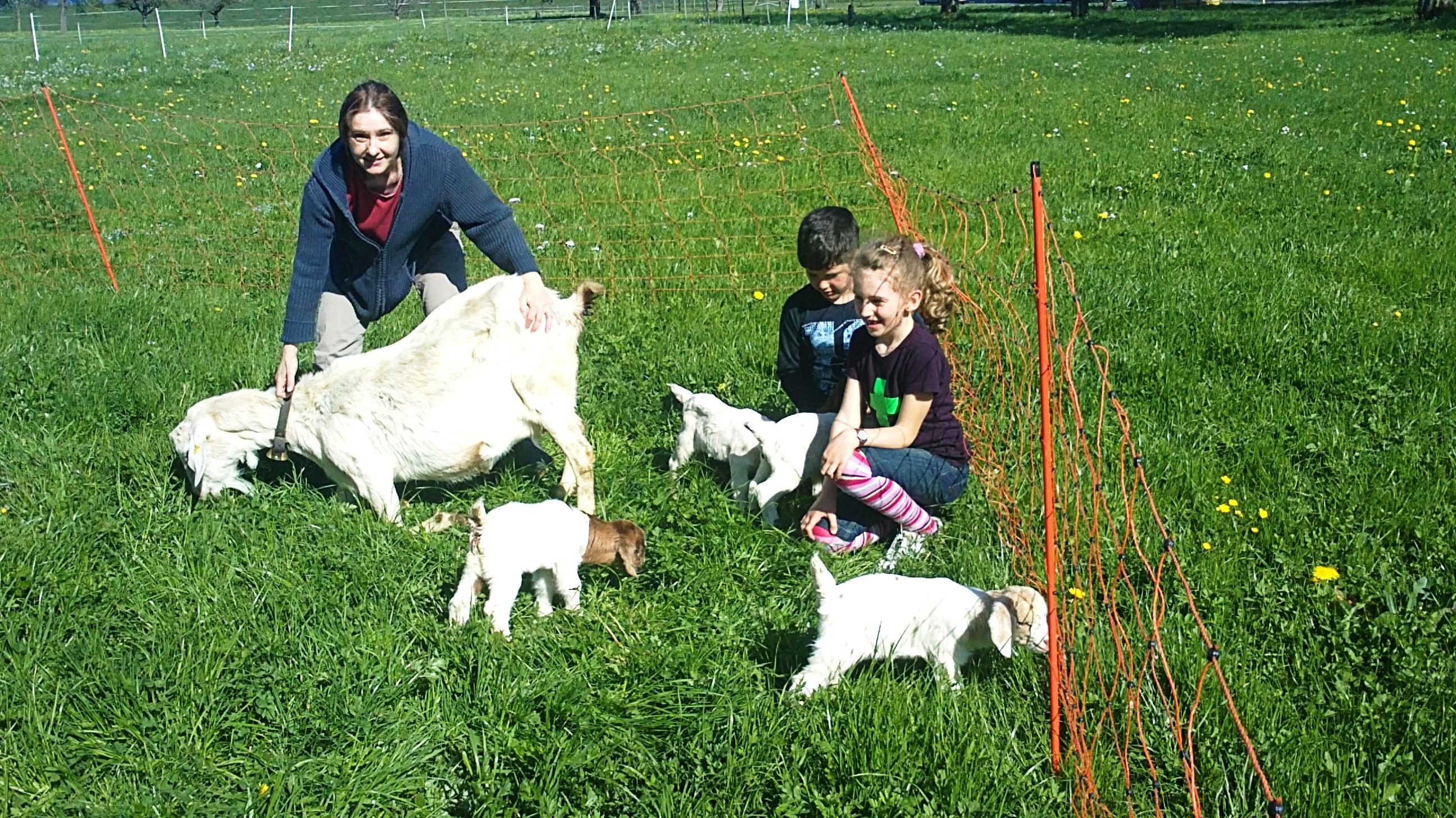 Monika, Manuel und Lauretta mit den Ziegen