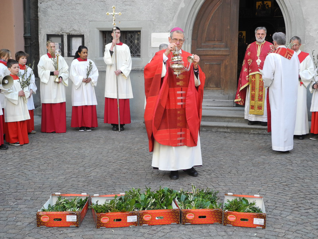 Bischof Elmar weiht vor der Frauenkirche die Palmbuschen.