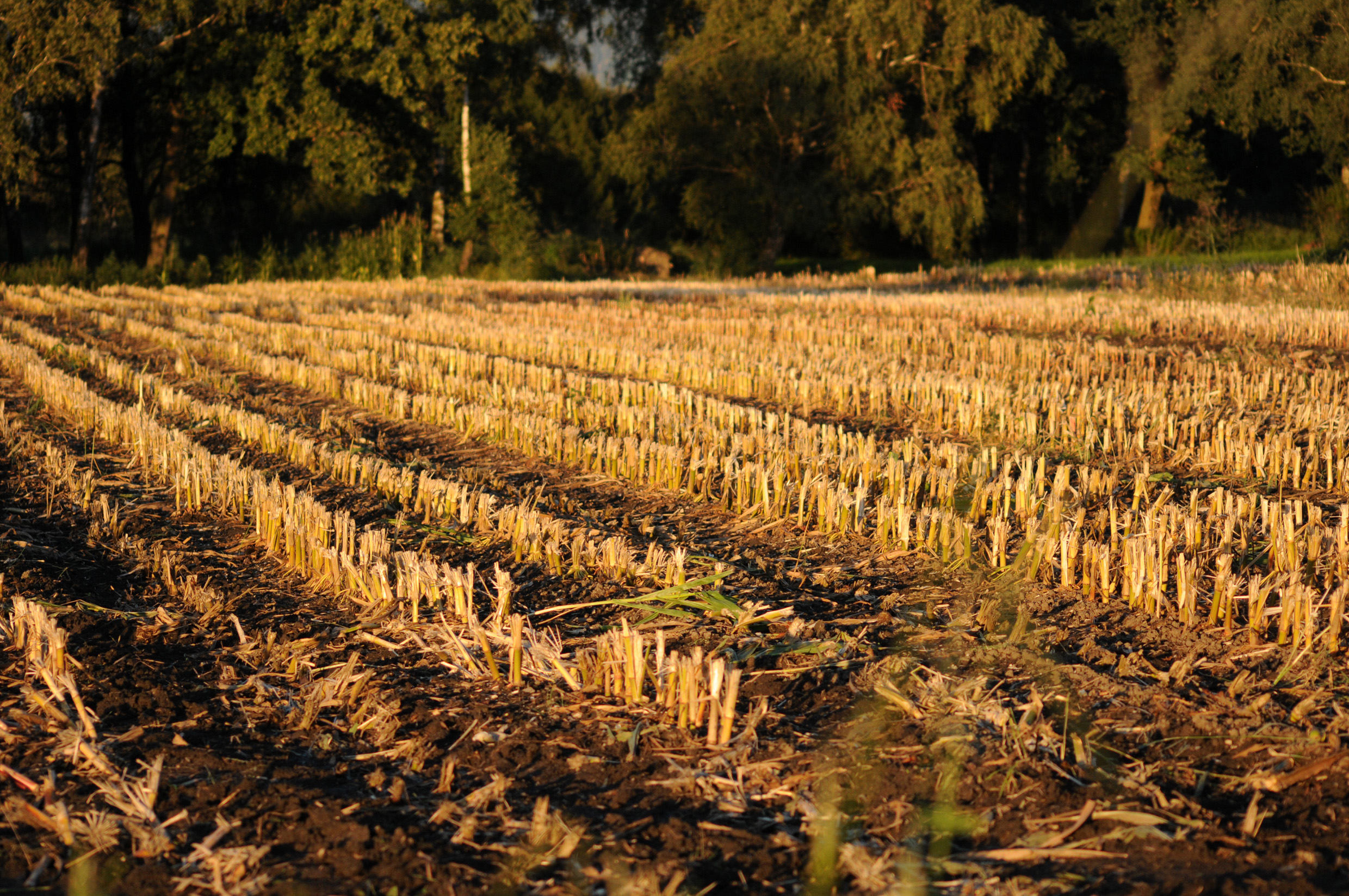 Abgeernteter Maisacker in der Abendsonne