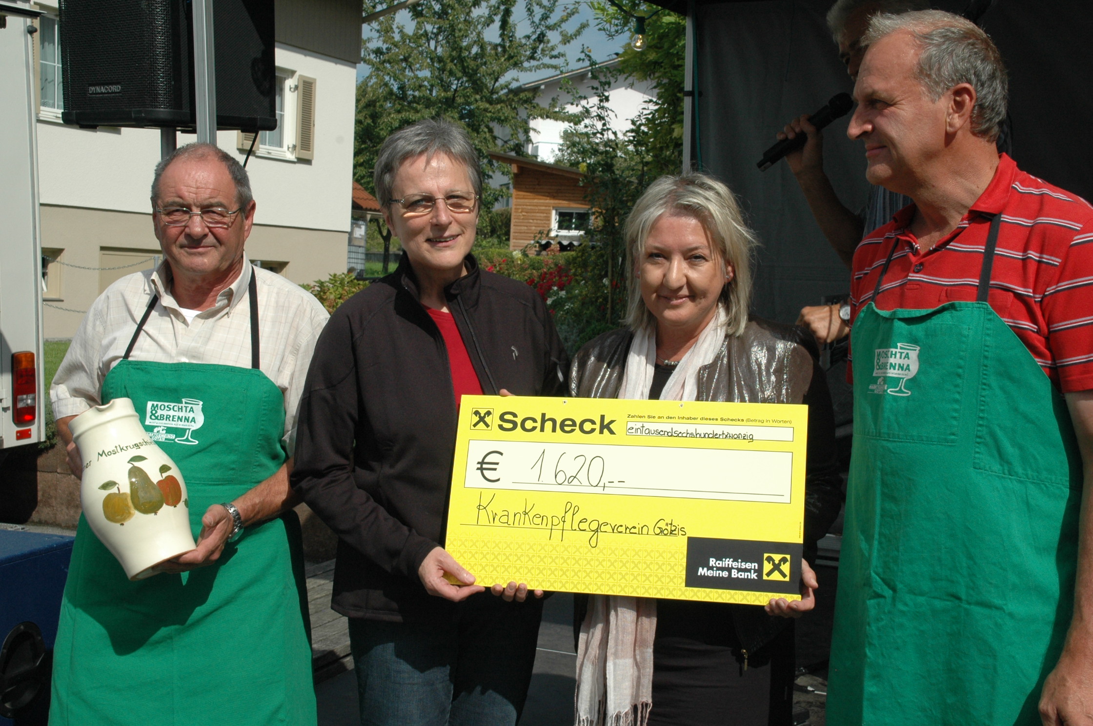 Scheckübergabe vor dem Junker Jonas Schlössle: v.l. Manfred Gwehenberger, Sr. Johanna Spildenner & Kassierin Jutta Oberhauser vom Götzner Krankenpflegeverein, Obmann v. Obst- und Gartenpflegeverein Paul Böckle