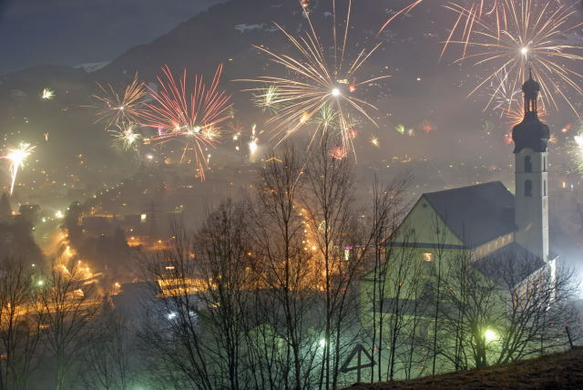 Neujahrsnacht 2010 in Tschagguns und Schruns. Aussichtspunkt: "Mottabühel" hinter der Pfarrkirche Tschagguns. (Foto: Gerhard Scopoli)