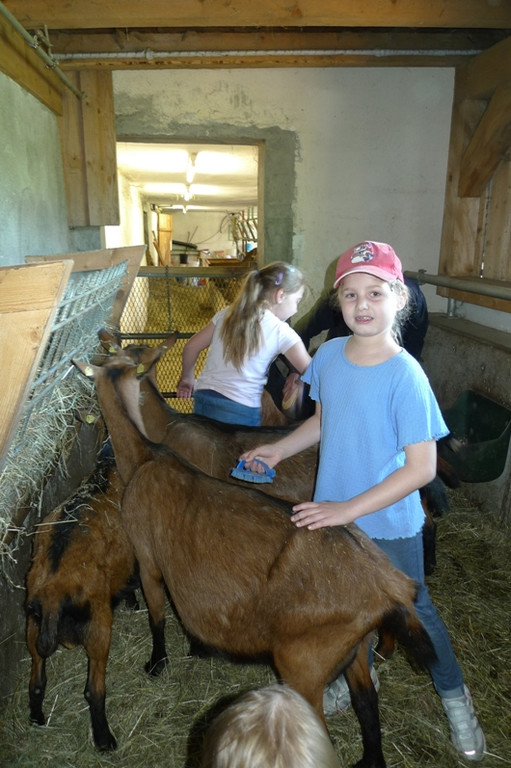 Emma striegelt eine Ziege.