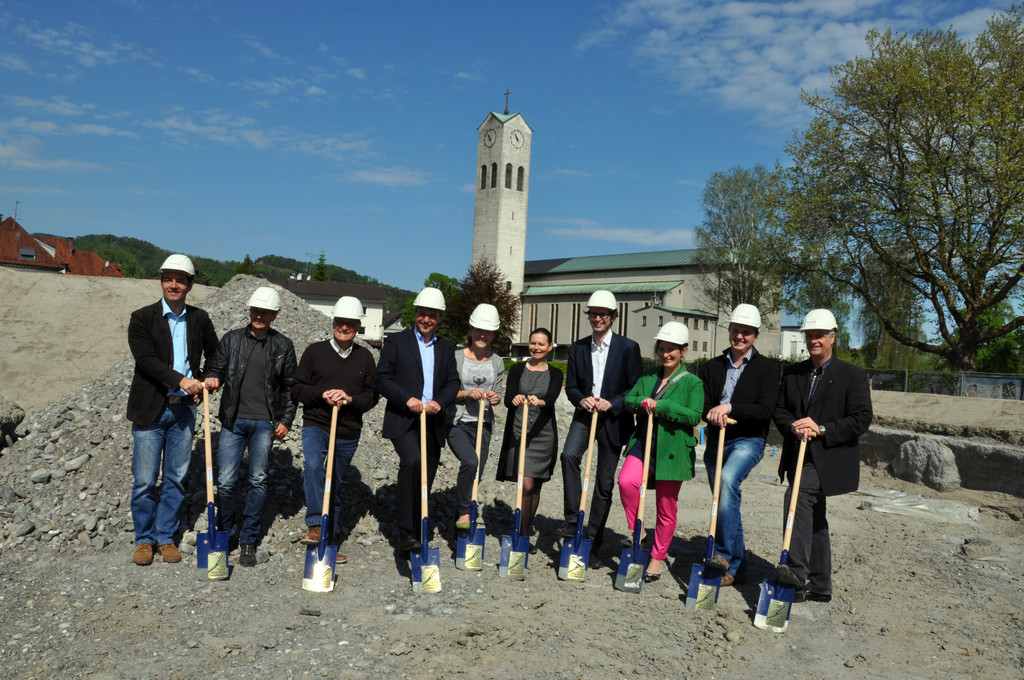 Der Spatenstich zum neuen Kindergarten Rheindorf wurde feierlich gesetzt von (vlnr): Bauleiter Thomas Flatschacher, Markus Waibl (Abteilung Hochbau Marktgemeinde Lustenau), Bildungsreferent Ernst Hagen, Bürgermeister Kurt Fischer, Kindergartenleiterin Sabine Walkner, Kindergarteninspektorin Andrea Dorner, Architekt Philipp Berktold, Architektin Susanne Bertsch, Generalunternehmer Bertram Dragaschnig und Vizebürgermeister Walter Natter.