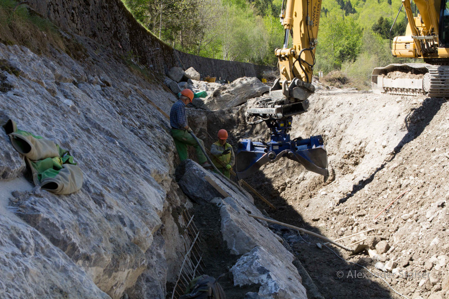 Die Steine werden auf das mit Stahl bewehrte Betonbett gelegt.