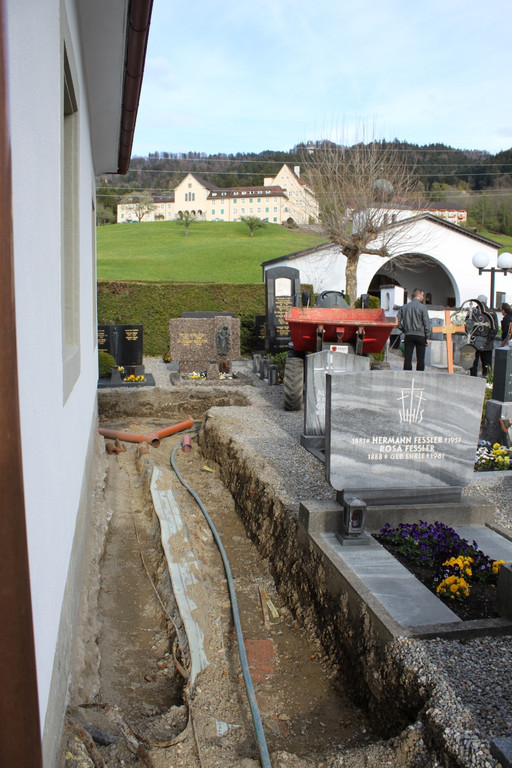 Arbeiten im Umfeld der Pfarrkirche mit Pflasterwegen und Abwasserleitungen