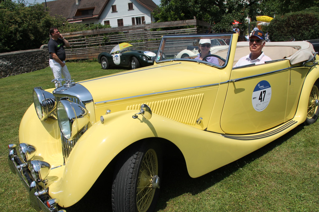 Prominenz aus Ludesch: Gerhard Huber, Geschäftsführer Wucher Helikopter und Ehefrau Monika im Jaguar MK IV.