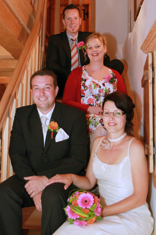 Brautpaar mit Kindern und Trauzeugen.