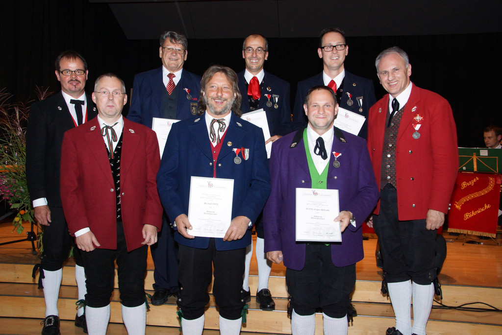 Verdienstmedaille in Silber für 25 Jahre: Herbert Marzluf, Willi Novosel *, (Eisenbahnermusik), Stephan Batlogg, Jürgen Zoller (Stadtmusik Bludenz), Michael Fritz (HM Dalaas), Marco Walser * (BM Nenzing), Jürgen Berjak (MV Thüringen) * nicht anwesend