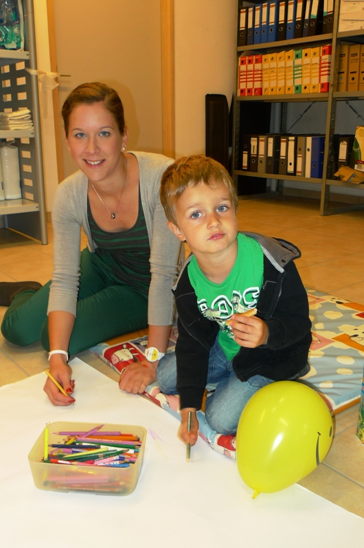 Betreuerin Lisi zeichnet mit Paul.