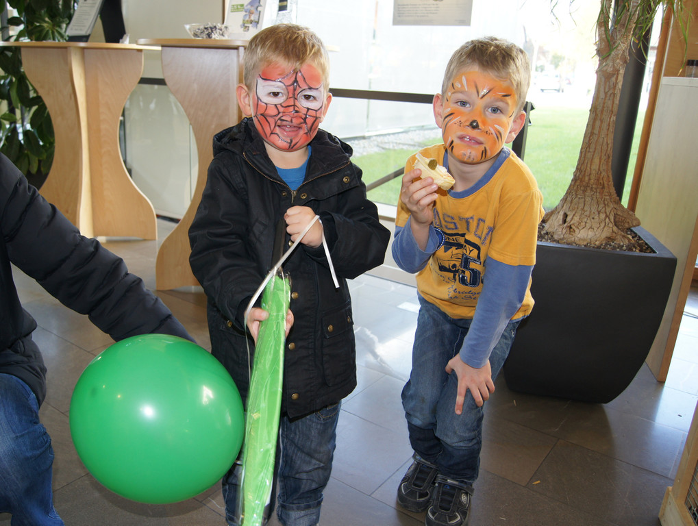 Mathias und Simon freuen sich über den grünen Regenschirm und Luftballon.