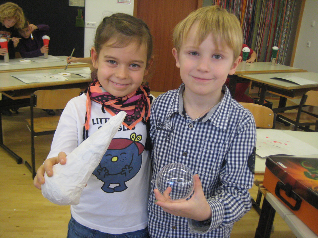 Im Werkunterricht der 2 a Klasse entstehen bewegliche NIkoläuse und Tannenbäume.