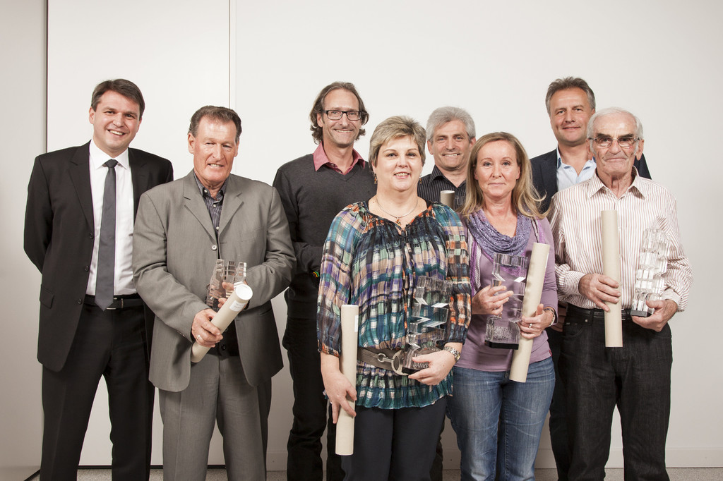 Geehrte vom Ski- und Snowboardverei, flankiert von Bgm. Dr. Kurt Fischer und dem Abteilungsleiter für Sport und Freizeit, Franz Kullich